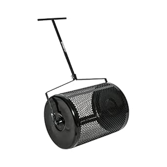 24 wide 18 diameter all steel. Landzie compost and peat moss spreader is an easy to use, lawn roller that will help with any topdressing job. Great sifting action allowing only the desired material to enter the lawn keeping the trash inside the drum.